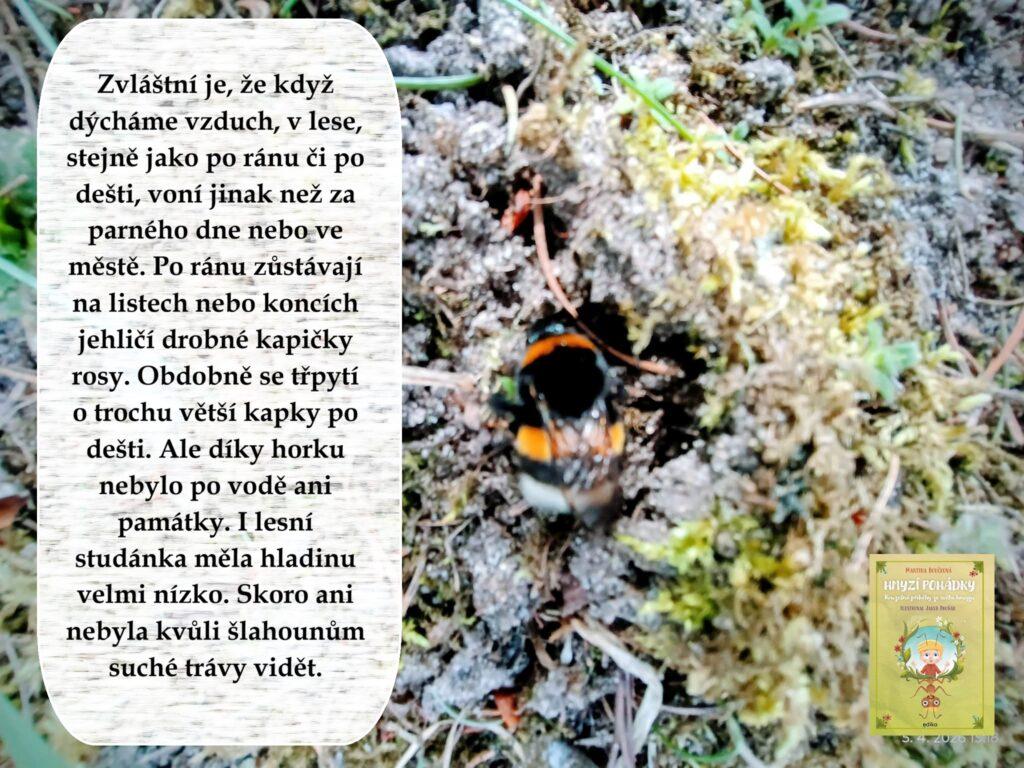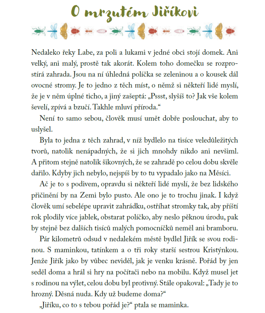 „…Když Jiřík otevřel oči, svět byl zase plný barev. Všechno kolem vonělo a lákalo k prozkoumání. Krajinou se táhl potok a kolem něho louka plná květin. Včelky pospíchaly, aby opylovaly květy, zlatohlávek se v letu třpytil na slunci. Jiřík sledoval mušky, motýly, po zemi pospíchajícího svižníka a mnoho dalších tvorů, které ani neznal jménem.“