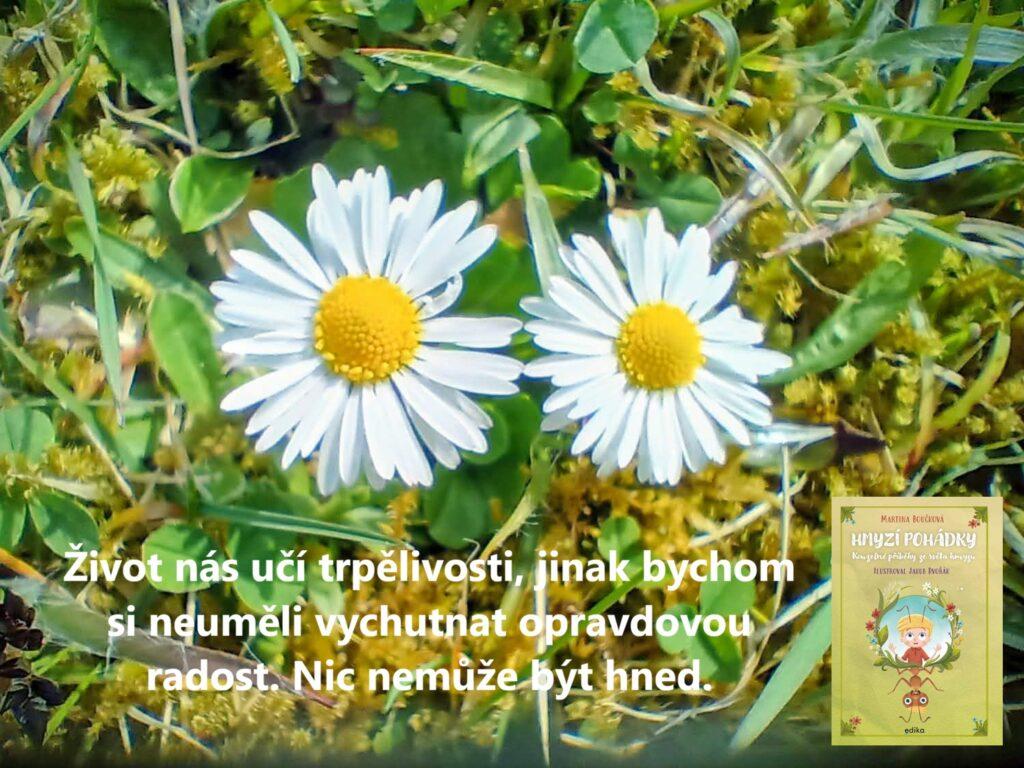„Pojď se honit, ty chytrolíne,“ postrkovala ho. „Já jsem motýlice jako ty. Jsi úplně stejná motýlice jako já.“ A zacvakala legračně zubisky, jako by ho chtěla pokousat. „Co říkáš, dáme si to až k tamté vrbě a zpátky? Schválně, kdo bude rychlejší?”